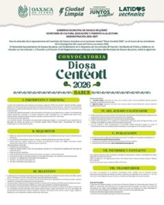 El Municipio de Oaxaca de Juárez, a través de la Secretaría de Cultura, Educación y Fomento a la Lectura, lanzó la convocatoria para participar en el proceso de selección de la representante del municipio en el certamen estatal Diosa Centéotl 2026, en el marco de la Guelaguetza.